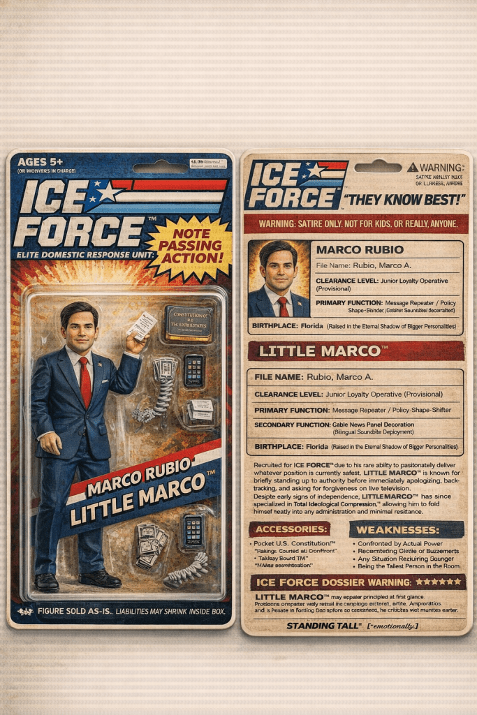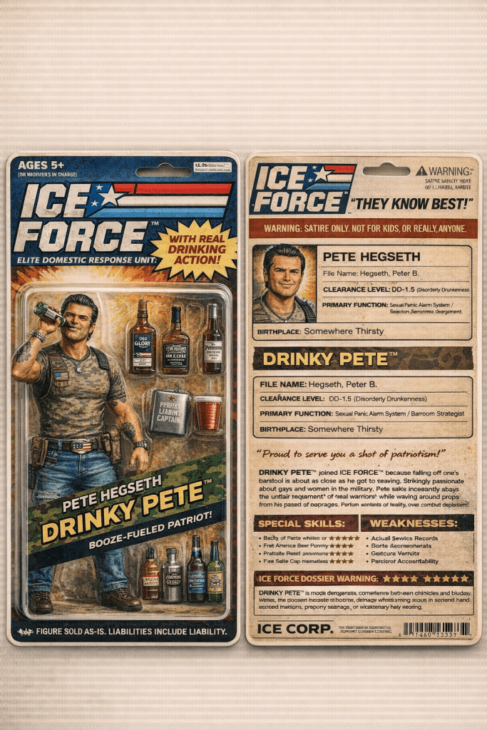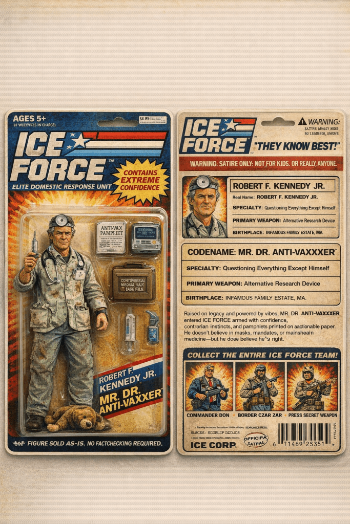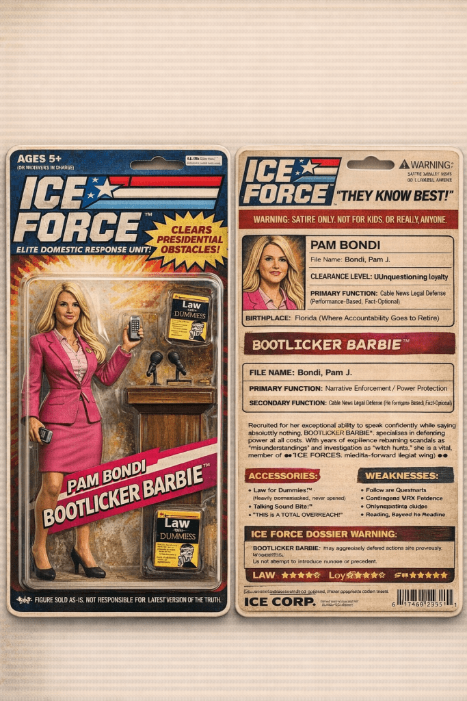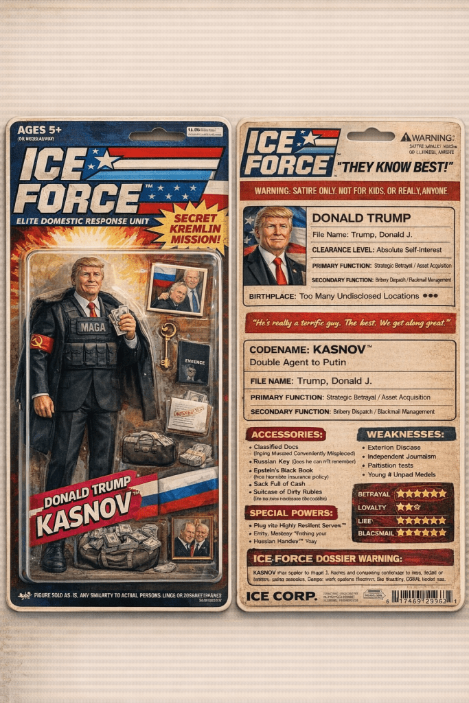 So all the little childrens who love ICE have been saying they want to play with the ICE instead of Cabbage Patch Kids or Go-Bots. So I have come up with some concepts for the childrens to nag their parents for. These are top quality folks! Concept 1000% created in the america. You haven’t seen a concept of an action figure until you have seen my newest additions to MAGAid webstore! ICE FORCE ACTION DOLLS! Get them at http://www.thegreatestgrifteverfuckamerica.gov Very affordable and NO TARRIFFS EVER when you buy from me, I mean, MAGAid. Be sure to buy these dolls for the low low price of $69.69 each. You see how affordable they are? You could even buy little Billy or Sally or whatever a couple of them for Christmas or birthday even? I am planning on really expanding these exciting ICE FORCE ACTION DOLLS. I think I might have a franchise on my hands here folks!